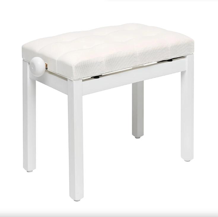 Біла банкетка з елегантним матовим покриттям і регульованою висотою від 49 до 56 см. Виготовлена з твердої деревини дуба, з сидінням, покритим білим оксамитом, забезпечує комфорт і стиль. Розміри сидіння 55 х 33 см, загальна вага 7,7 кг.